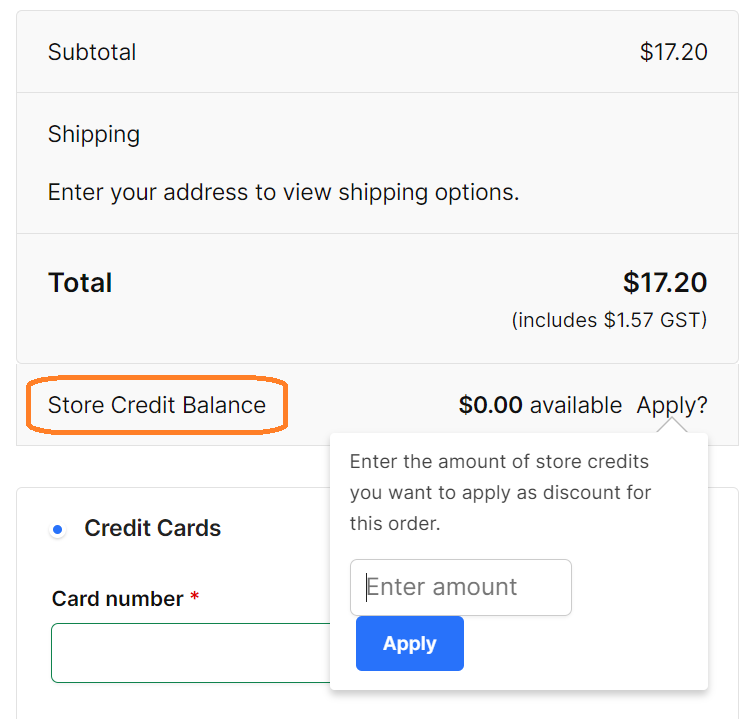 On the checkout page, the option to pay using your store credit is located below the total amount of your order. Click “Apply?” and enter the desired amount that you want to use. Remember that you should have enough balance to be able to use this payment option.