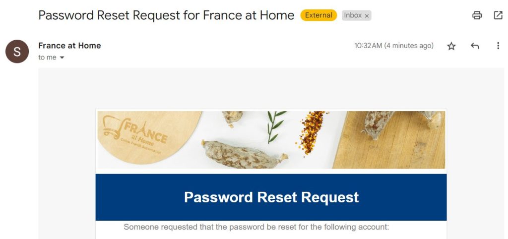 3. Wait for an email from France at Home (info@franceathome.com.au) with the subject line “Password Reset Request for France at Home” and then proceed to click the password reset link.